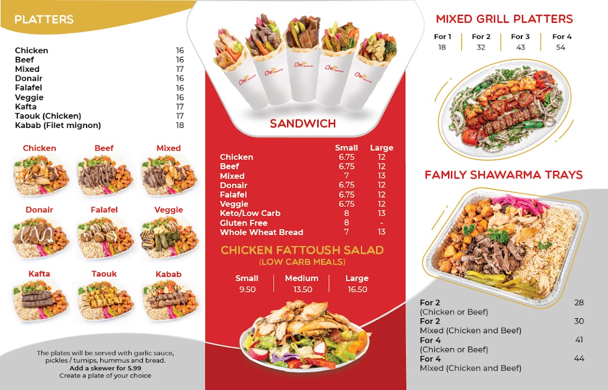 The menu is a delightful array of options featuring tantalizing main platters and sandwiches that showcase the best of Middle Eastern flavors. Among the standout dishes, the Chicken Platter and the Beef Platter each come adorned with a choice of fluffy brown or white rice, savory potatoes, a refreshing fattoush salad, and soft pita bread—all for just CA$16.00. For those who want to sample more, the Mixed Platter provides a flavorful combination for CA$17.00.